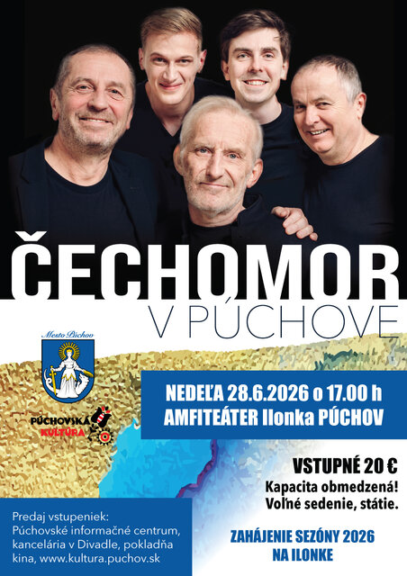 Nezabudnuteľná atmosféra, je určite to pravé slovo, keď u nás koncertuje ČECHOMOR. Ich známe hity zaznejú v nedeľu 28.6.2026 o 17.00 h u nás v Púchove.